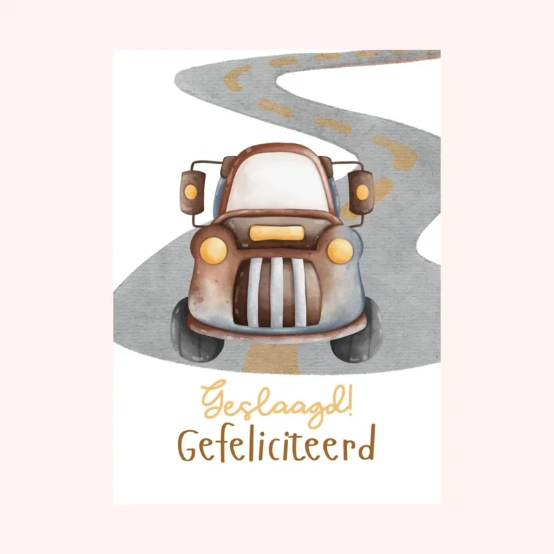 Heb je iemand die net geslaagd is voor zijn of haar rijbewijs? Verras ze dan met deze geweldige kaart! De aquareltekening van een antieke auto op de weg, gecombineerd met de tekst “Geslaagd! Gefeliciteerd,” maakt deze kaart ideaal voor deze bijzondere mijlpaal.