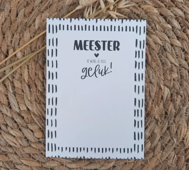 Deze stijlvolle A6-kaart van MIEKinvorm is precies wat je nodig hebt! Met de tekst ‘Meester, ik wens je veel geluk!’, is er ook genoeg ruimte om een persoonlijk bericht of tekening toe te voegen. Een geweldige manier om de meester te bedanken en hem veel geluk toe te wensen voor de toekomst!