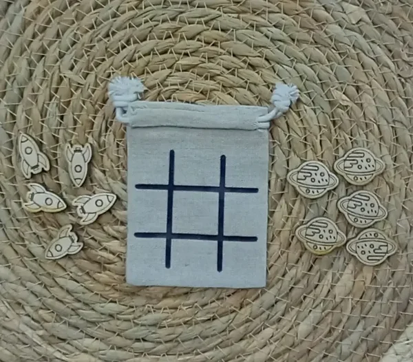 Speel drie-op-een-rij in ruimtestijl! 🚀 De raket- en planeetsteentjes maken het extra leuk. Dankzij het katoenen zakje met speelbord op de buitenkant speel je overal – thuis, op reis of onderweg. Een superleuk cadeautje voor kids en spelletjesfans! 🌟