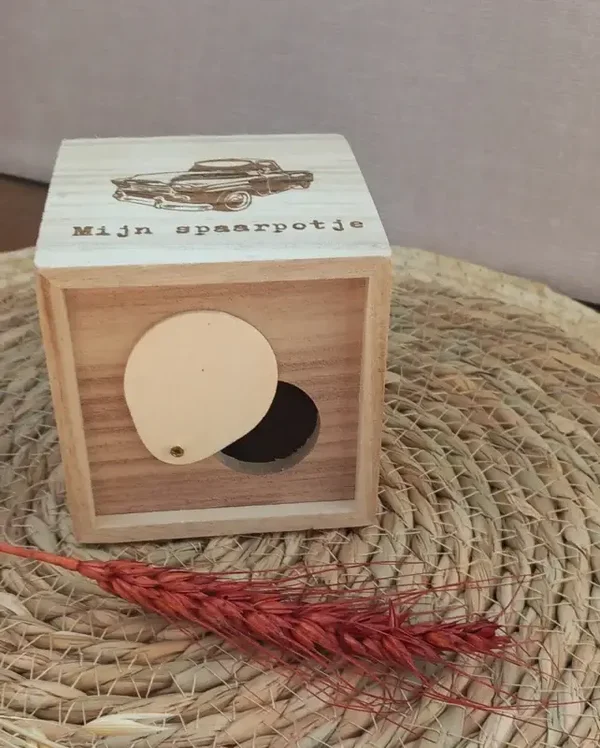 Hoe leuk is dit houten spaarpotje met een gegraveerde vintage auto en de tekst “mijn spaarpotje”! 🚗💛 Perfect om kinderen spelenderwijs te leren sparen én meteen een prachtige decoratie voor de kinderkamer. Maak het extra speciaal met de naam van het kind. Een origineel en blijvend cadeau voor de geboorte, verjaardag, of zomaar!