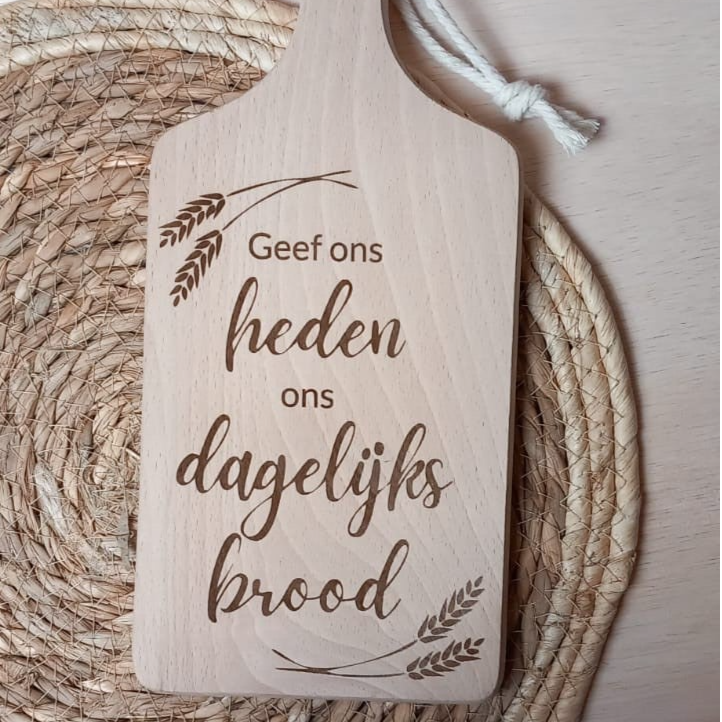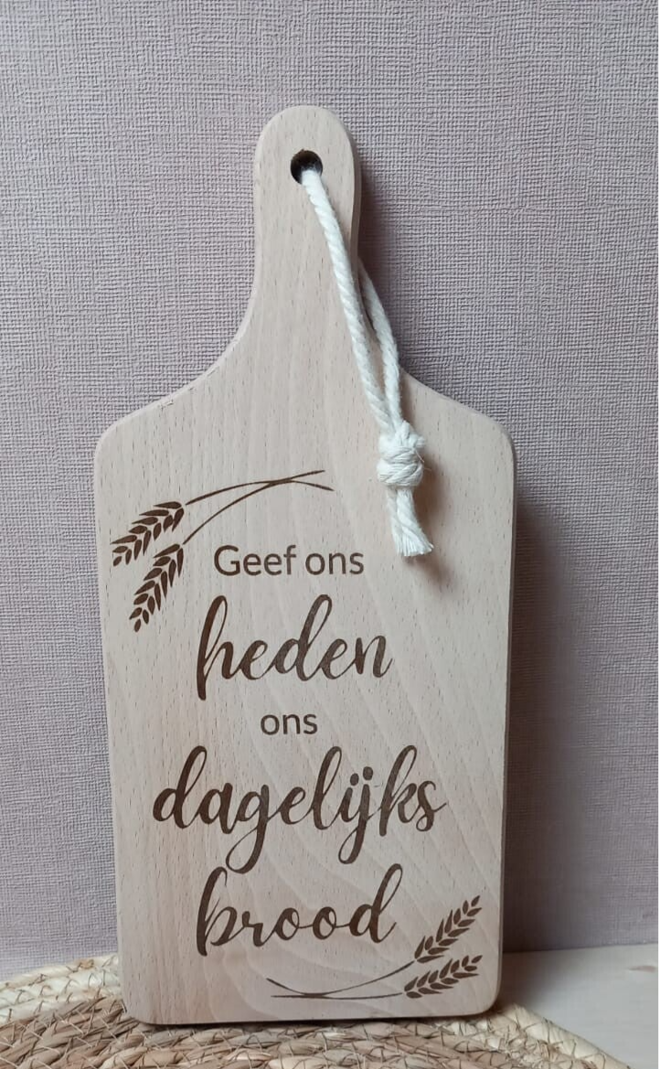 Houten snijplank – 30 cmMet de tekst "Geef ons heden ons dagelijks brood", prachtig gegraveerd. Mooi als decoratie of als cadeau voor in de keuken.