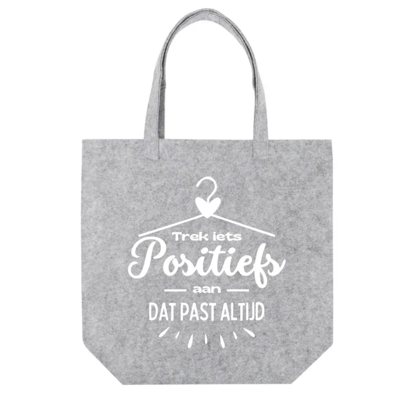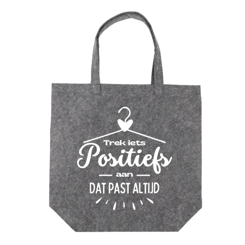 Op zoek naar een origineel cadeau voor je vriendin? Laat haar stralen met onze prachtige vilten tote bag, bedrukt met de inspirerende quote: "Trek iets positiefs aan, dat past altijd". Deze tas heeft een ronde bodem en meet 42 x 42 + 2 x 6 cm, biedt voldoende ruimte voor al haar benodigdheden.