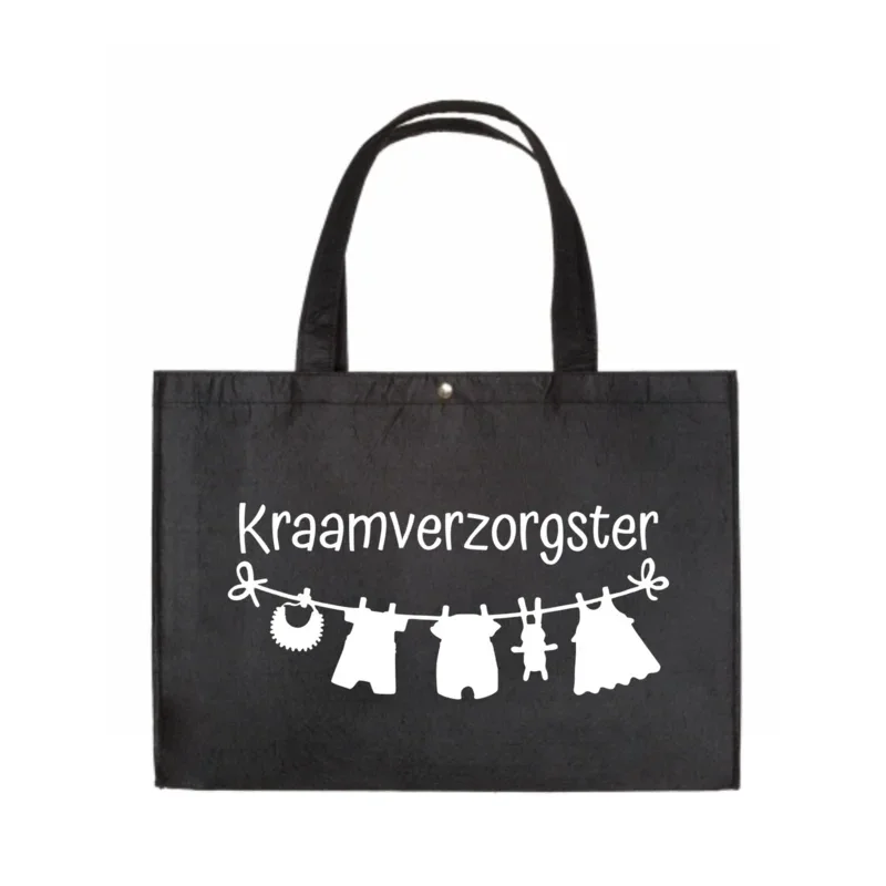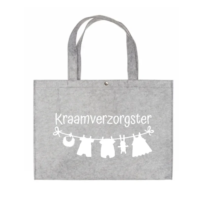 Stevige vilten tas met opdruk: 'Kraamverzorgster' met waslijntje