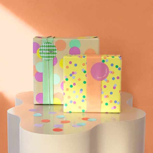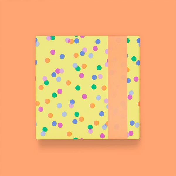 Op zoek naar cadeaupapier waar je blij van wordt? Dit gele papier met kleurrijke confettistippen zorgt meteen voor een feestje. De achterkant is effen zalmroze, dus je kunt het ook leuk omvouwen voor een speels randje.