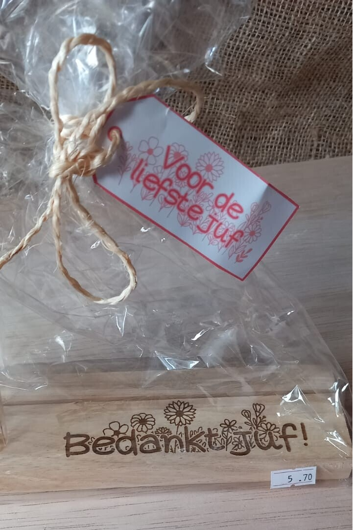 Een vrolijk en persoonlijk bedankje voor het einde van het schooljaar! Deze houten kaartenhouder is gegraveerd met de tekst ‘bedankt juf’ en versierd met speelse bloemetjes rondom de tekst. In het houdertje zit een glazen reageerbuisje met een klein bosje droogbloemen – een blijvend boeketje voor een juf die het verdient.