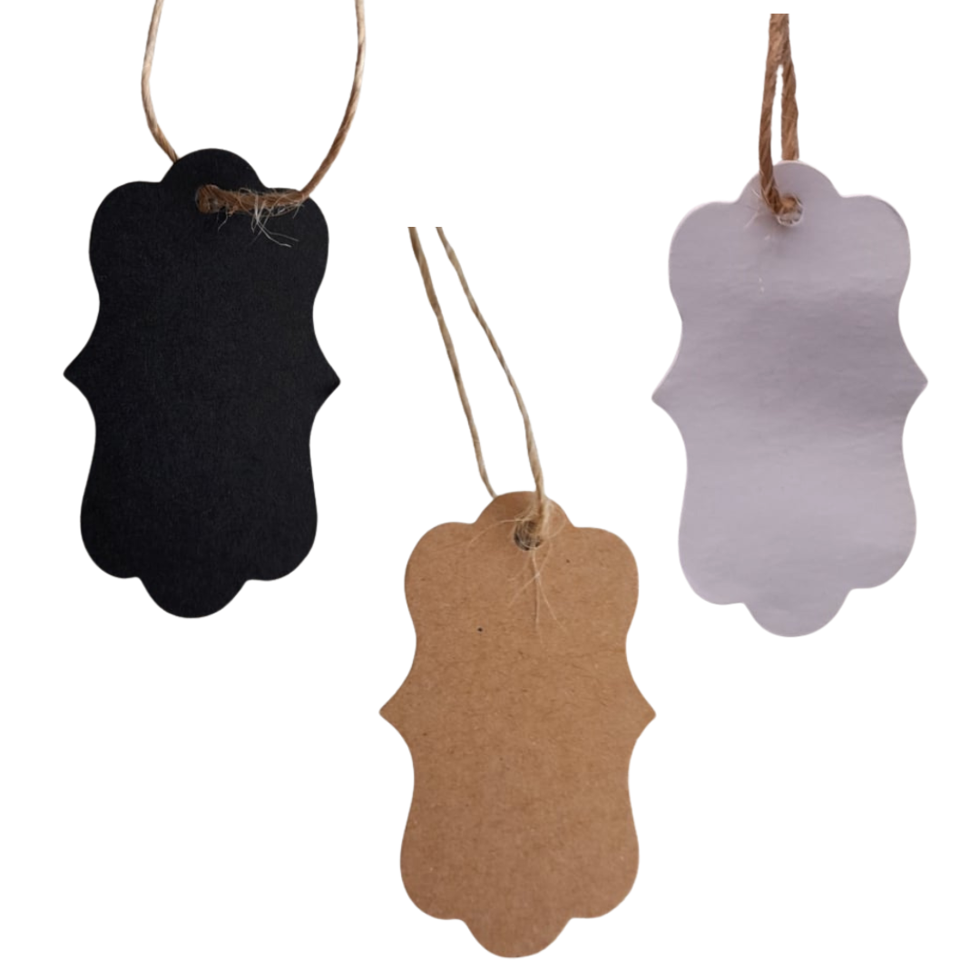 Ovale Cadeaulabels met Geschulpt Randje – 20 Stuks met Touwtje | Zwart, Wit & Kraftkleur