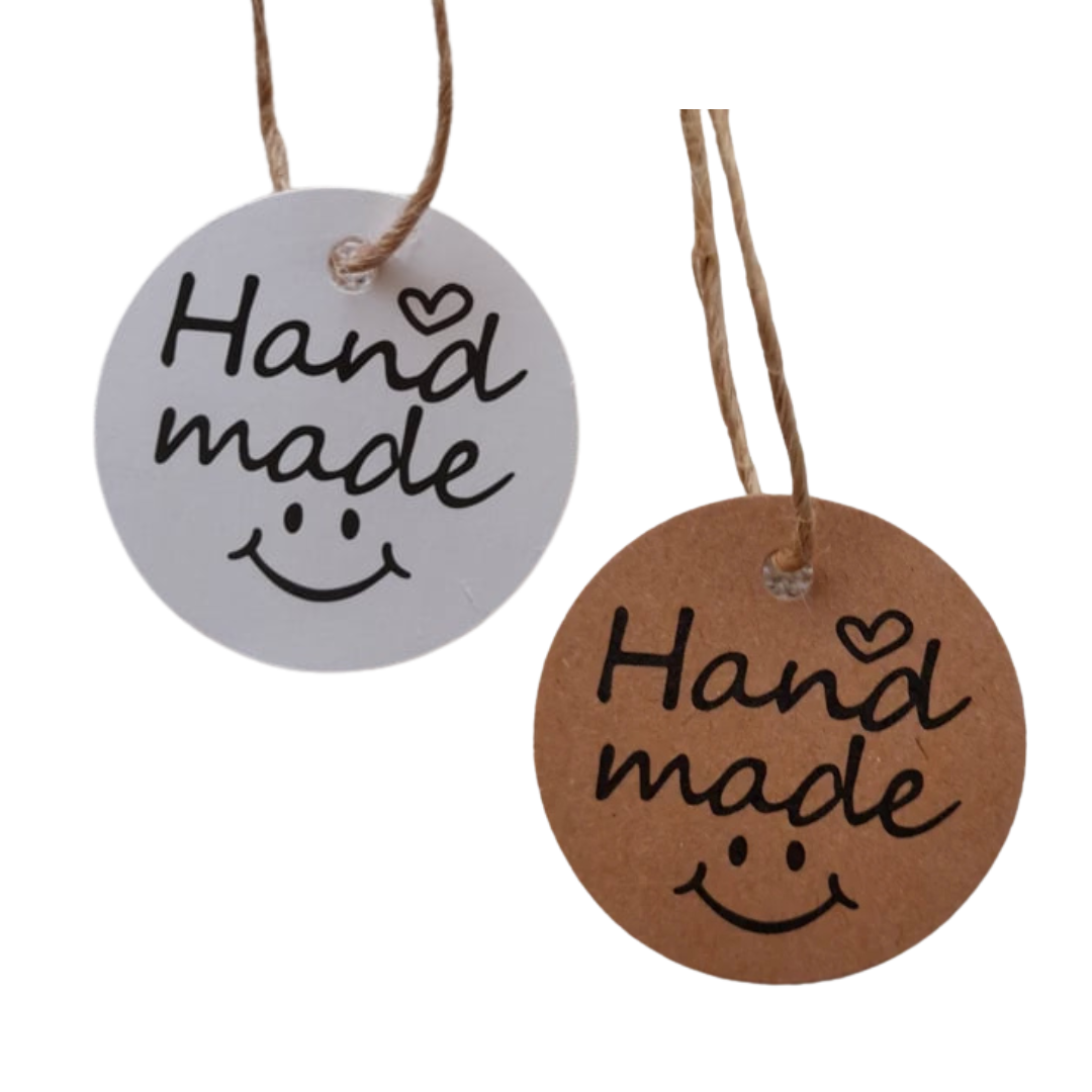 Ronde Cadeaulabels ‘Handmade’ met Hartje & Smiley – 20 Stuks met Touwtje | In Kraft of Wit