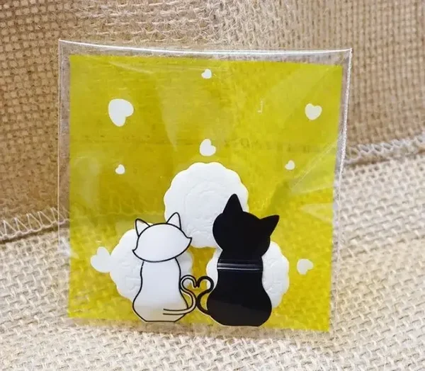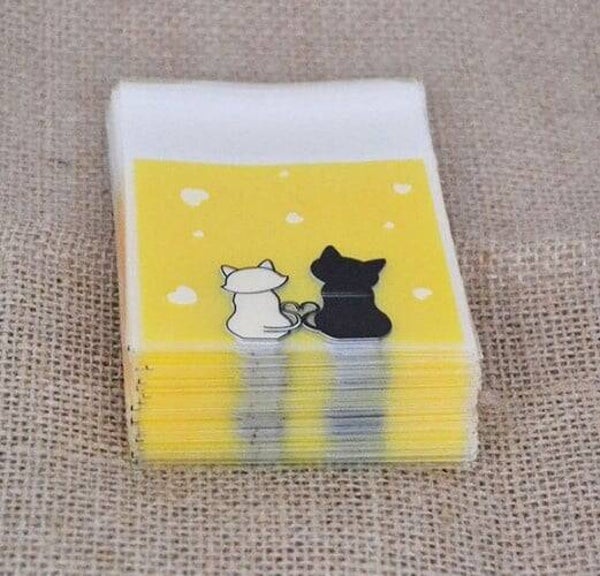 Verpak je kleine traktaties met deze lieve traktatiezakjes van 7x7 cm. De transparante voorkant is versierd met een zwart en een wit poesje en schattige hartjes, terwijl de achterkant vrolijk geel is. Dankzij de plakstrip sluit je de zakjes makkelijk en stevig af. Perfect voor feestjes, kindertraktaties en andere leuke gelegenheden!
