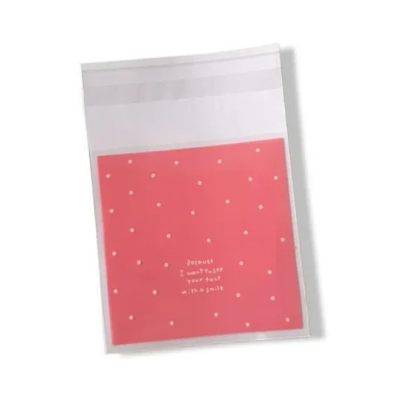 Verpak je kleine traktaties met deze lieve traktatiezakjes van 7x7 cm. De transparante voorkant is versierd met witte stippels en de tekst: “because I want to see your face with a smile.” De achterkant is zacht roze. Dankzij de plakstrip sluit je de zakjes makkelijk en stevig af. Perfect voor feestjes, kindertraktaties en andere vrolijke gelegenheden!