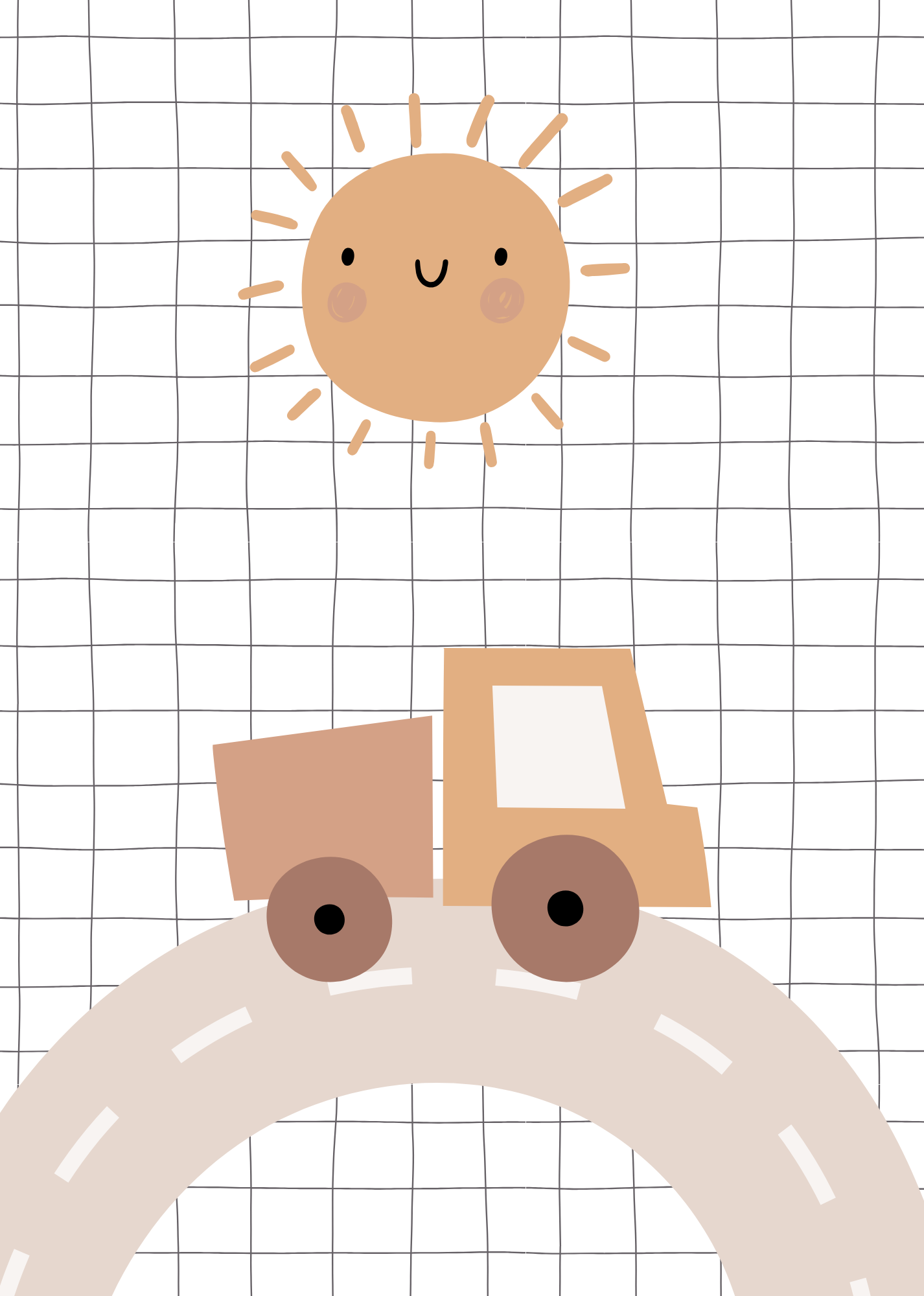 Een poster met een vrachtwagen op de weg, met een vrolijk zonnetje erboven en een strak zwart grid op de achtergrond.
