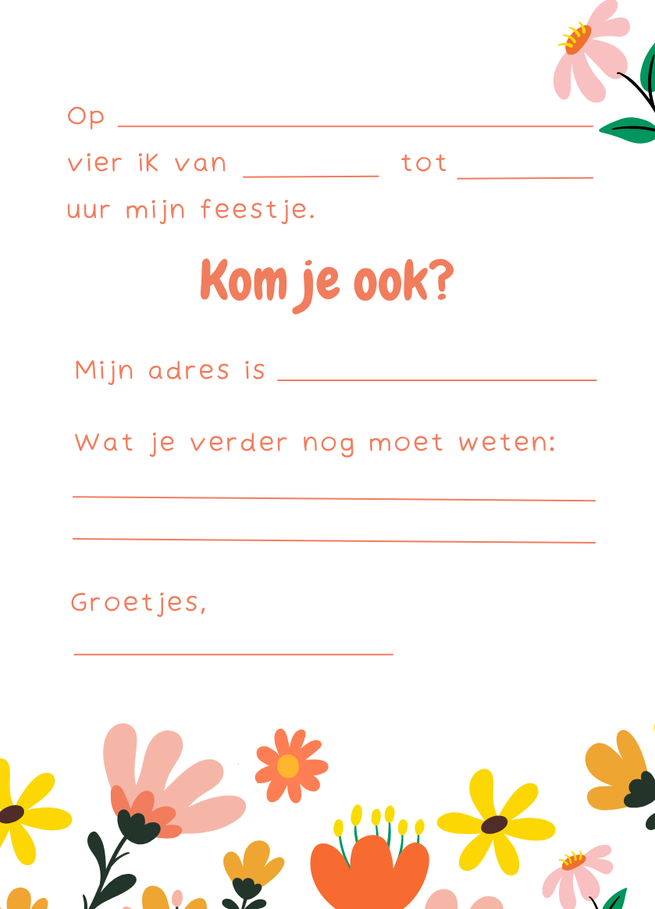 Nodig vrienden in stijl uit met deze vrolijke uitnodigingskaart! De kaart is versierd met kleurrijke bloemen en heeft een moderne, frisse uitstraling. Ideaal voor meiden of tieners die hun feestje leuk willen beginen.