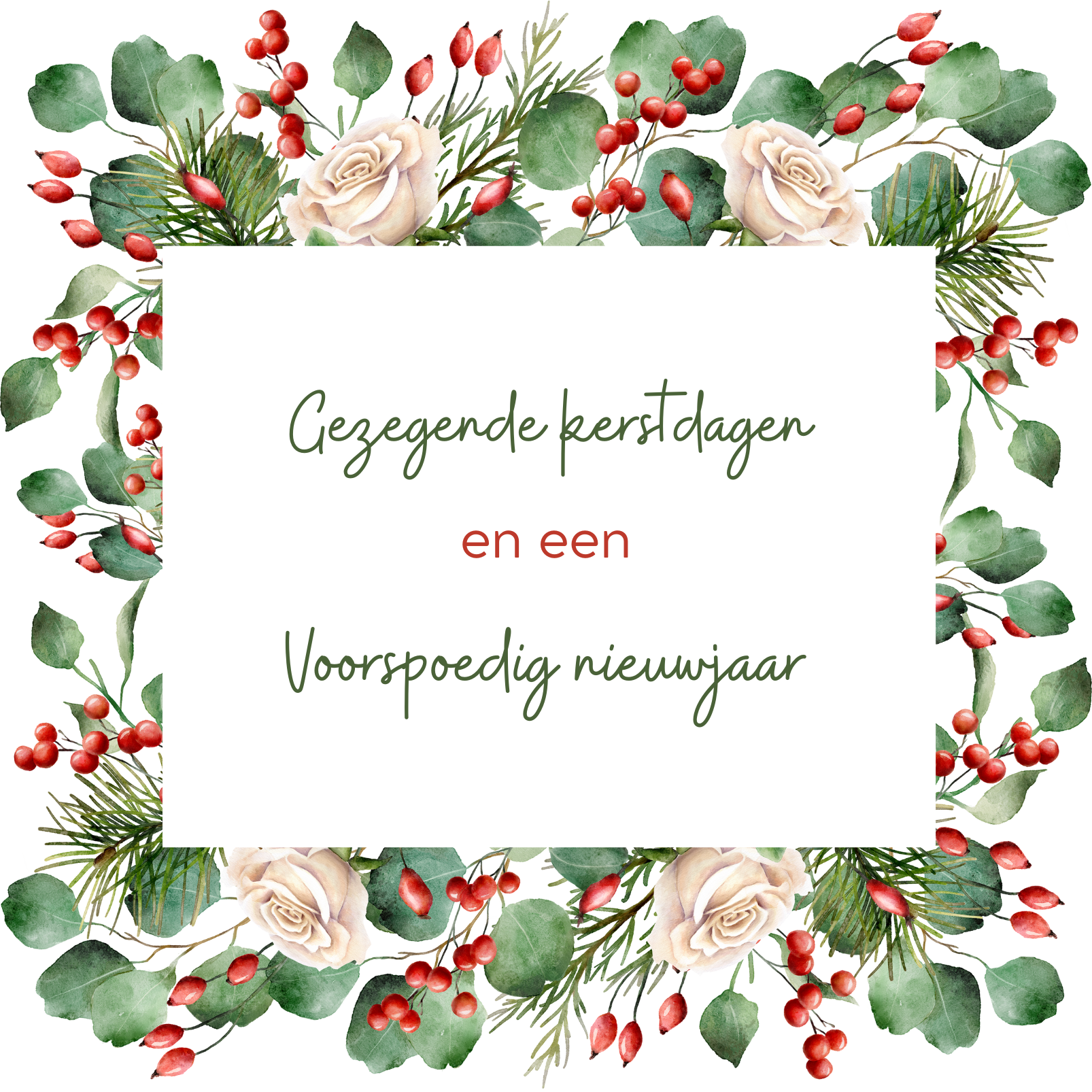 Een stijlvolle dubbele kaart (13 x 13 cm) met een kader van eucalyptusbladeren, witte rozen en rode besjes. Perfect voor volwassenen die een warme, stijlvolle kerst- en nieuwjaarsgroet willen sturen.