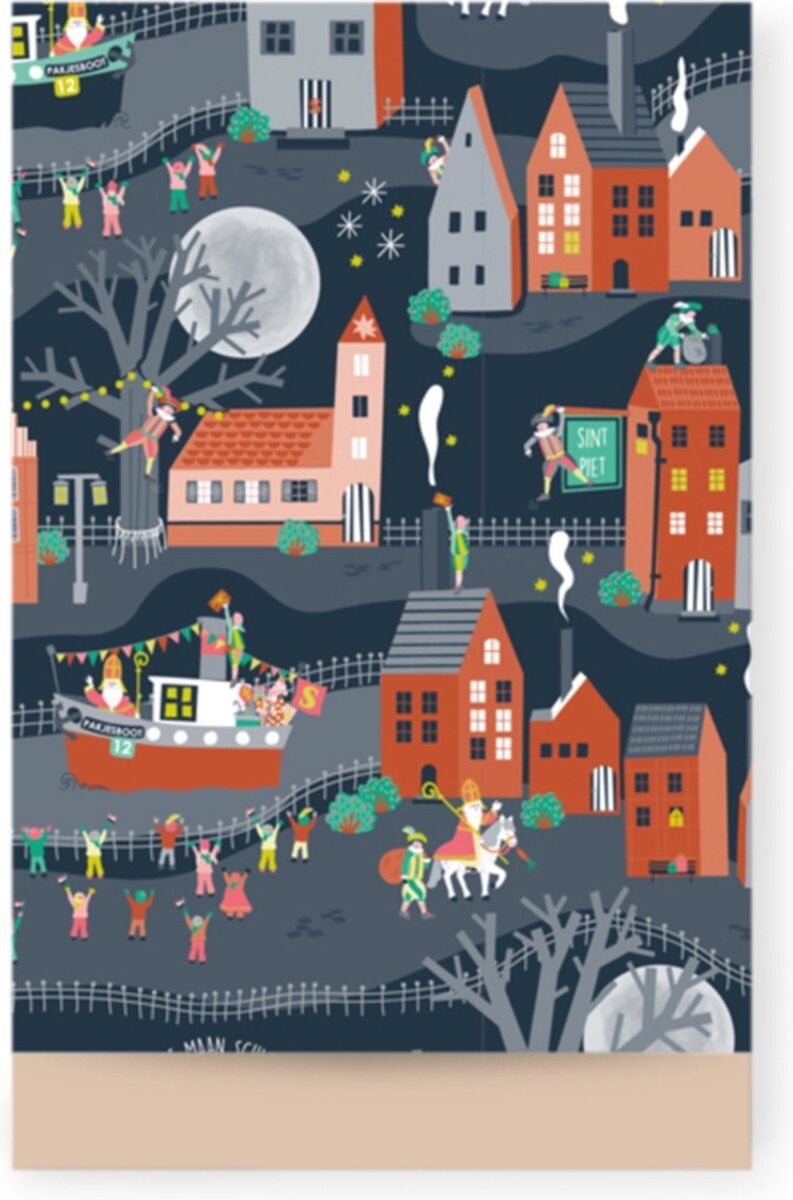 - Ontwerp: Donkerblauwe achtergrond met afbeelding van de sinterklaasintocht, inclusief stoomboten, slingers, huisjes en Pieten